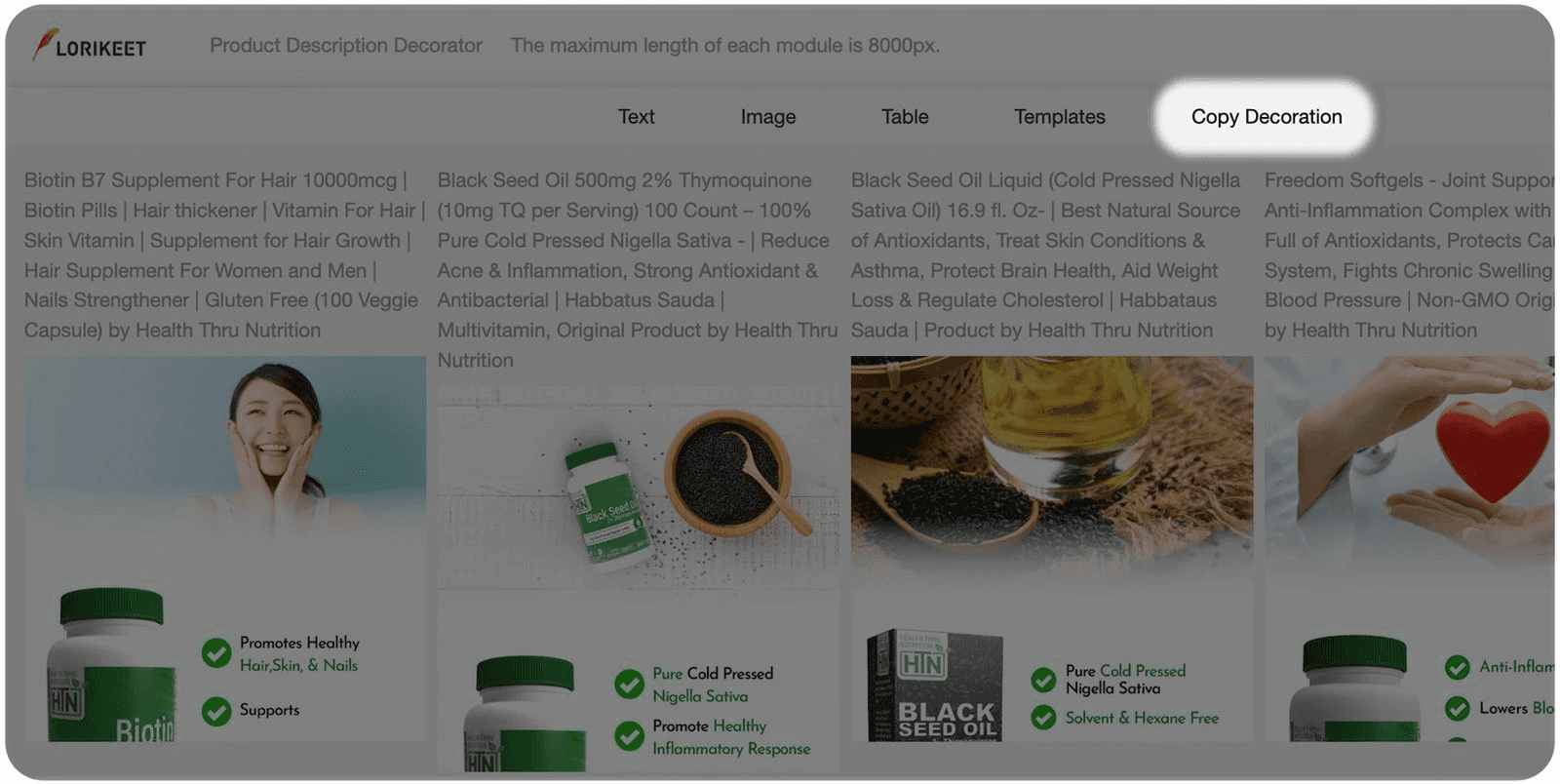Copy Decoration feature in Lazada Lorikeet can copy the Lorikeet from your other product listings. This can save a lot of time if certain parts of your Lorikeet are the same as the other products.