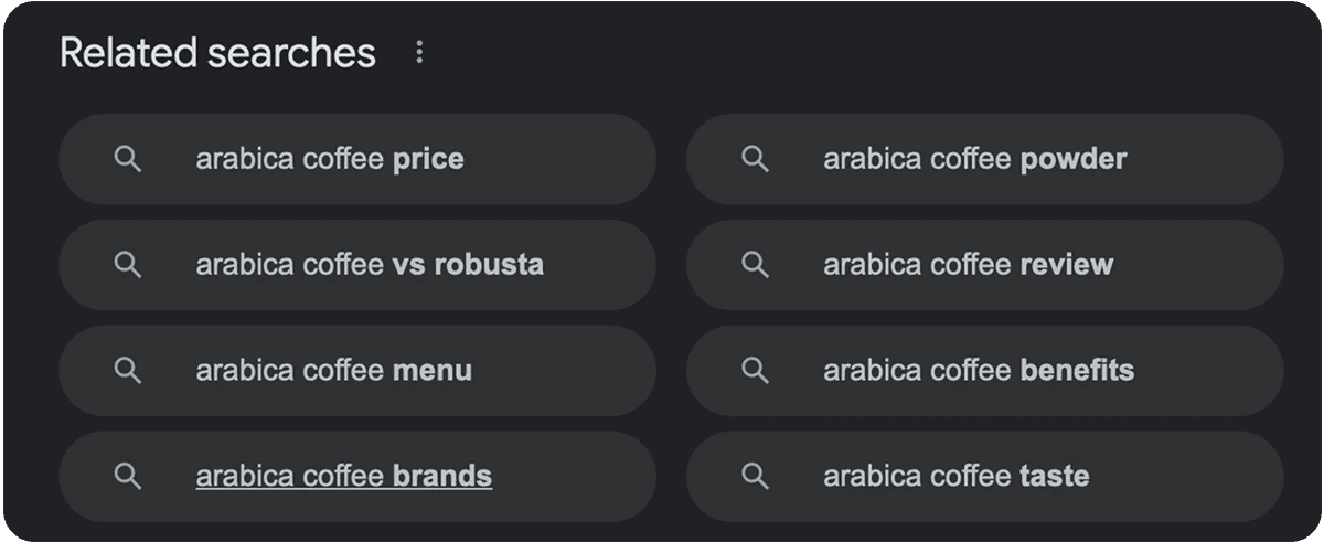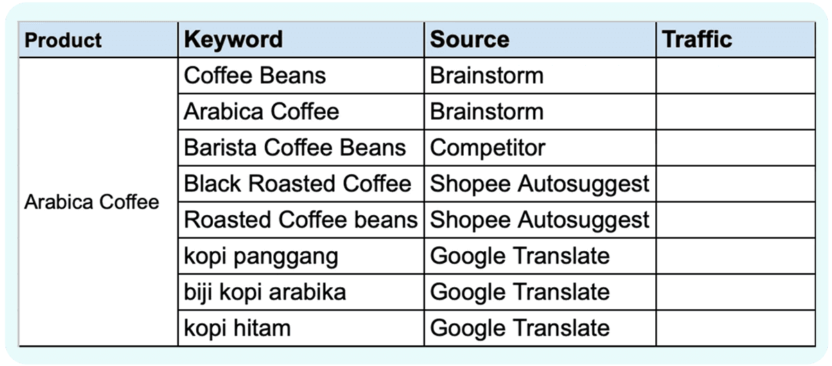 With the above information, you can brainstorm initial search terms like “Arabica Coffee Beans”, “Roasted Coffee Beans”, “Barista Special”, etc., that you think your customers would use to search for your product.